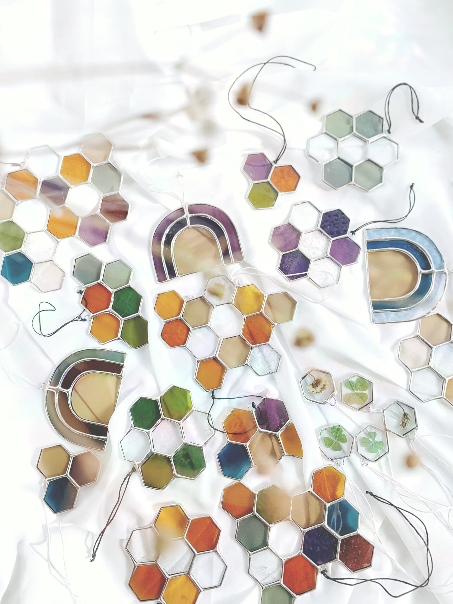 Also known as the Tiffany method, this technique consists of wrapping each piece of glass in copper foil tape (we refer to it as foiling). Then the foiled pieces are soldered together with an alloy. Traditionaly, the alloy is made of lead. However, I have made the conscious choice to exclusively work with lead free solder.